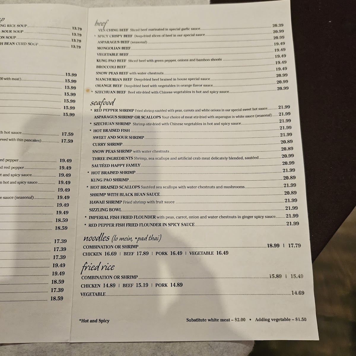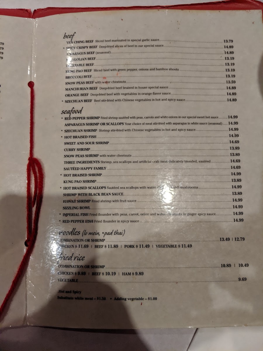 - Main Dishes: A range of meat, seafood, and vegetable-based dishes such as Seafood Sizzling Bowl, Sweet and Sour Chicken, Imperial Chicken, Princess Chicken Lunch Special, Cashew Chicken Deep Fried, and Northern Style Vegetable Deluxe. Modifications such as all white meat or added tofu can be requested for some dishes.